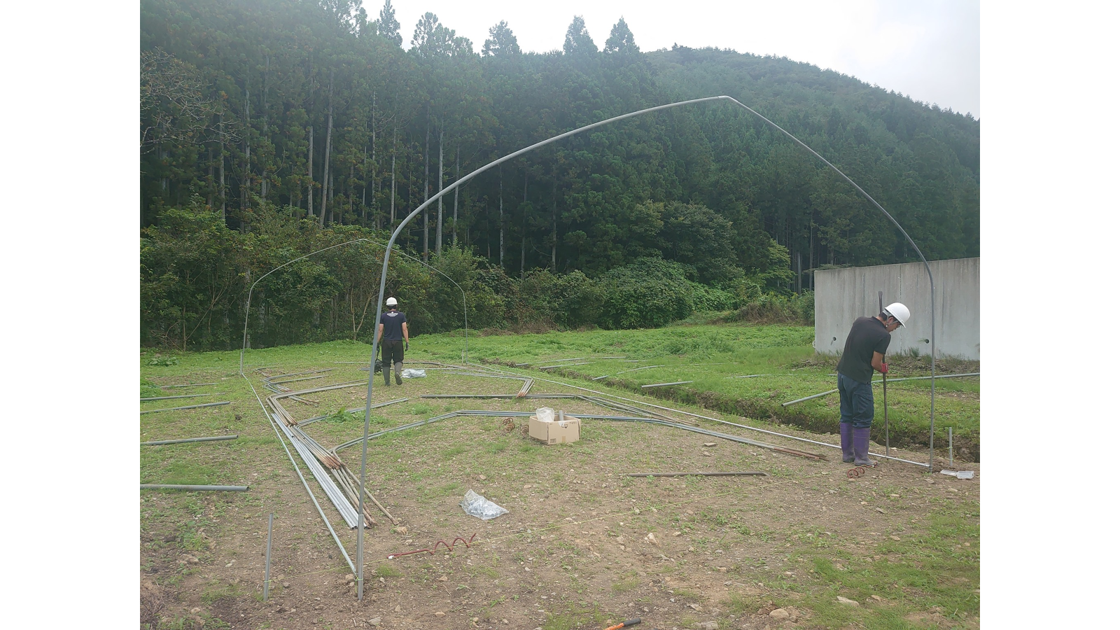 ちなみに私達は正確な直角を出すためにレーザーを使用しています。こちらはプロ向けですので皆さんは三平方の定理で直角を出してみてください。直角が出し終わったら次はアーチパイプを挿し込んでいきます。
