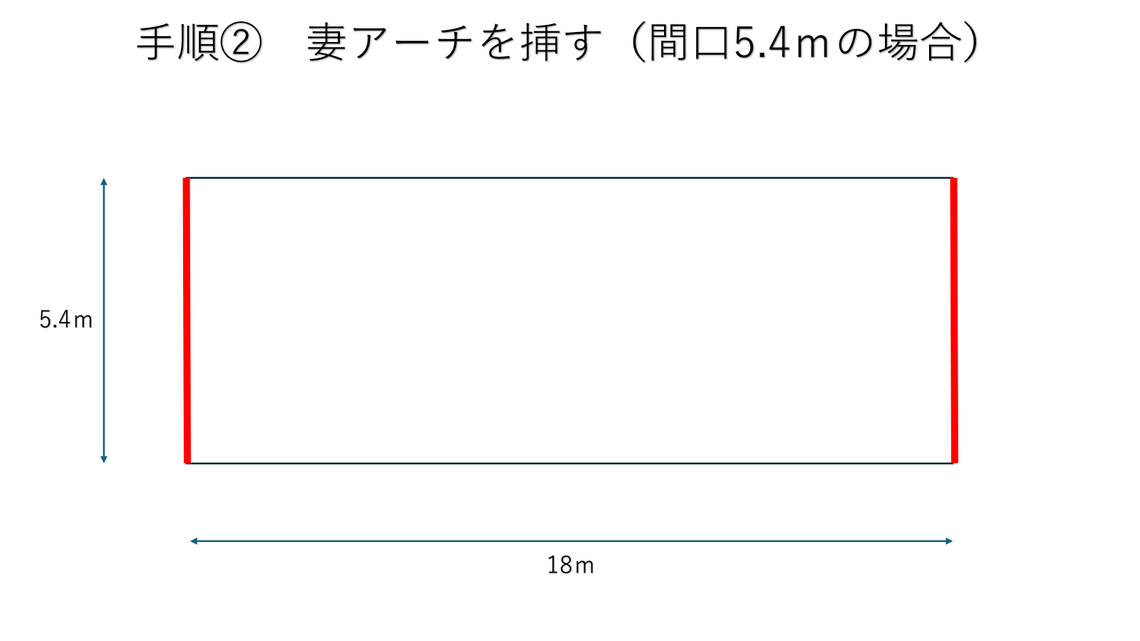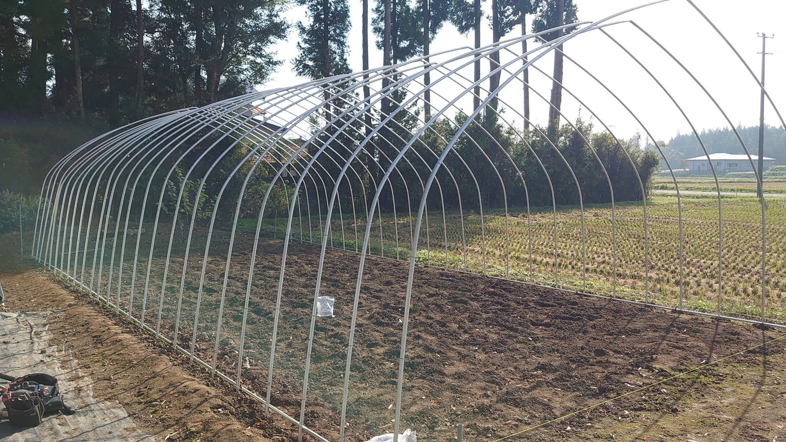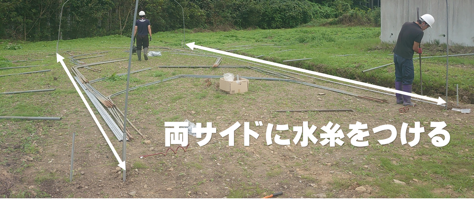 仮に5.4m×18mだとすると、妻面アーチ(入口、出口)の1組目を挿してしまう方法もあります。そうするとパイプとパイプを水糸で結べば直線がでますので平行ラインを作ることができます。