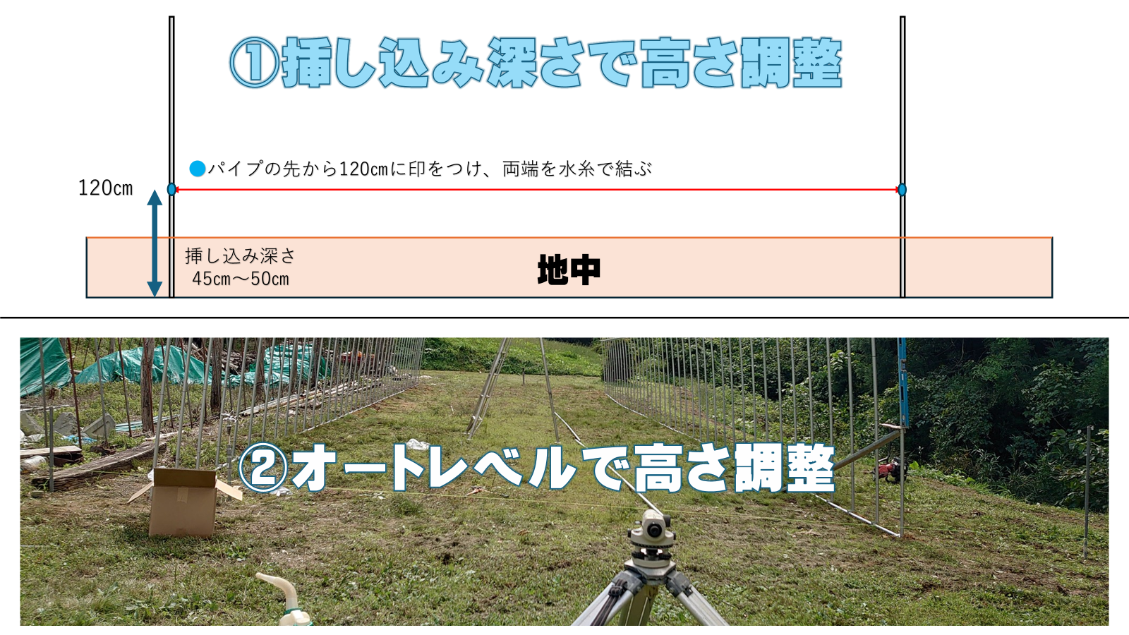 あとはパイプの先から120㎝で統一した印にピンピンと張った水糸を合わせていけば綺麗に高さを揃えることができます。高さを調整しつつクロスワンという資材で地際に並べたパイプとアーチパイプを固定していきます。詳しくは■トップページの動画でまとめていくのでぜひ見てみてください。