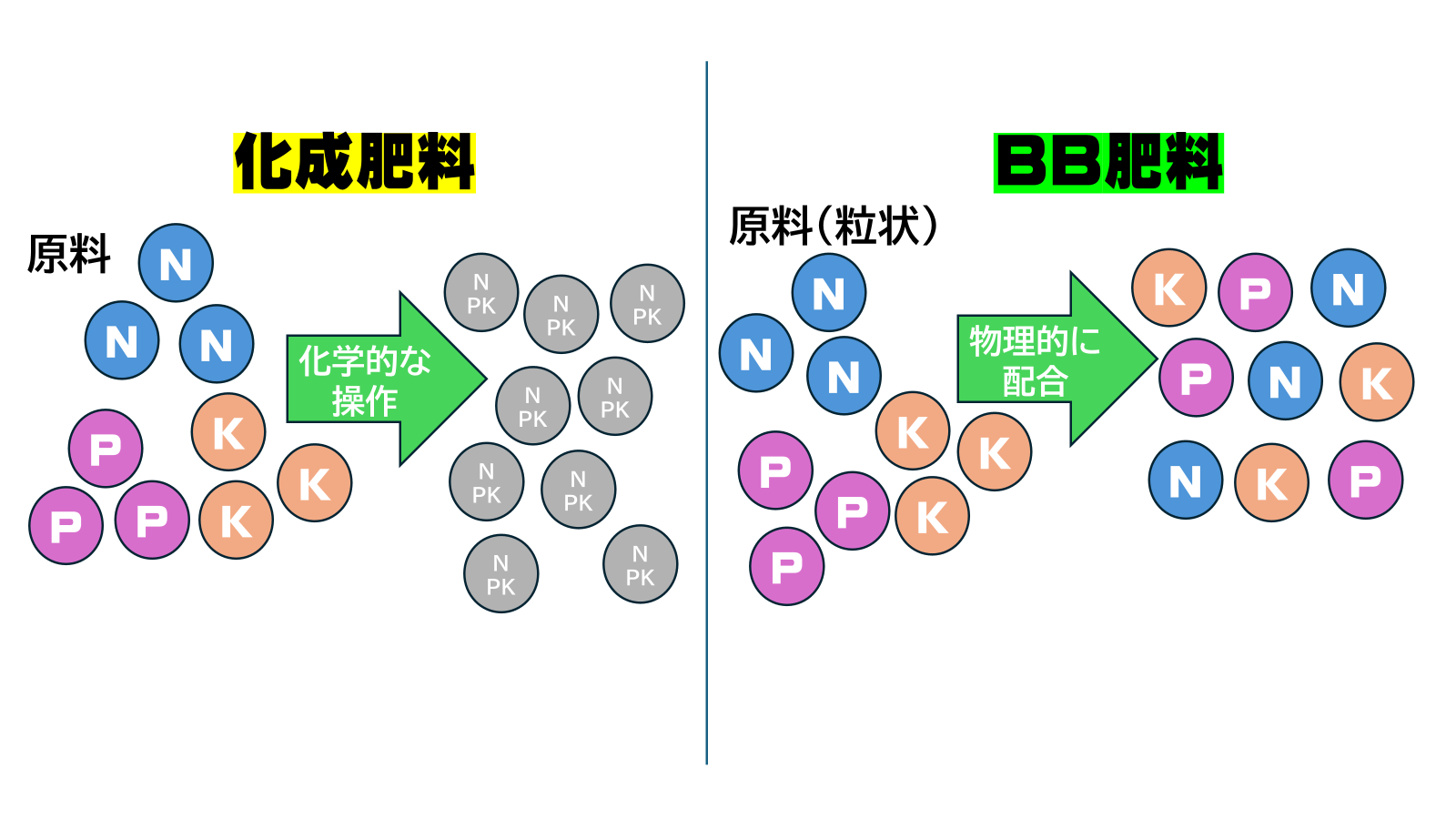 - それぞれの原料ごとに粒状になっており、それを単純に混ぜ合わせたもの。基本的に1粒に1つの成分しか含まれておらず、様々な色や形の肥料が混ざり合った見た目をしています。化成肥料のように燃料や水を使用せず粒状の原料を物理的に混合するだけなので環境にやさしく、低コストな肥料です。