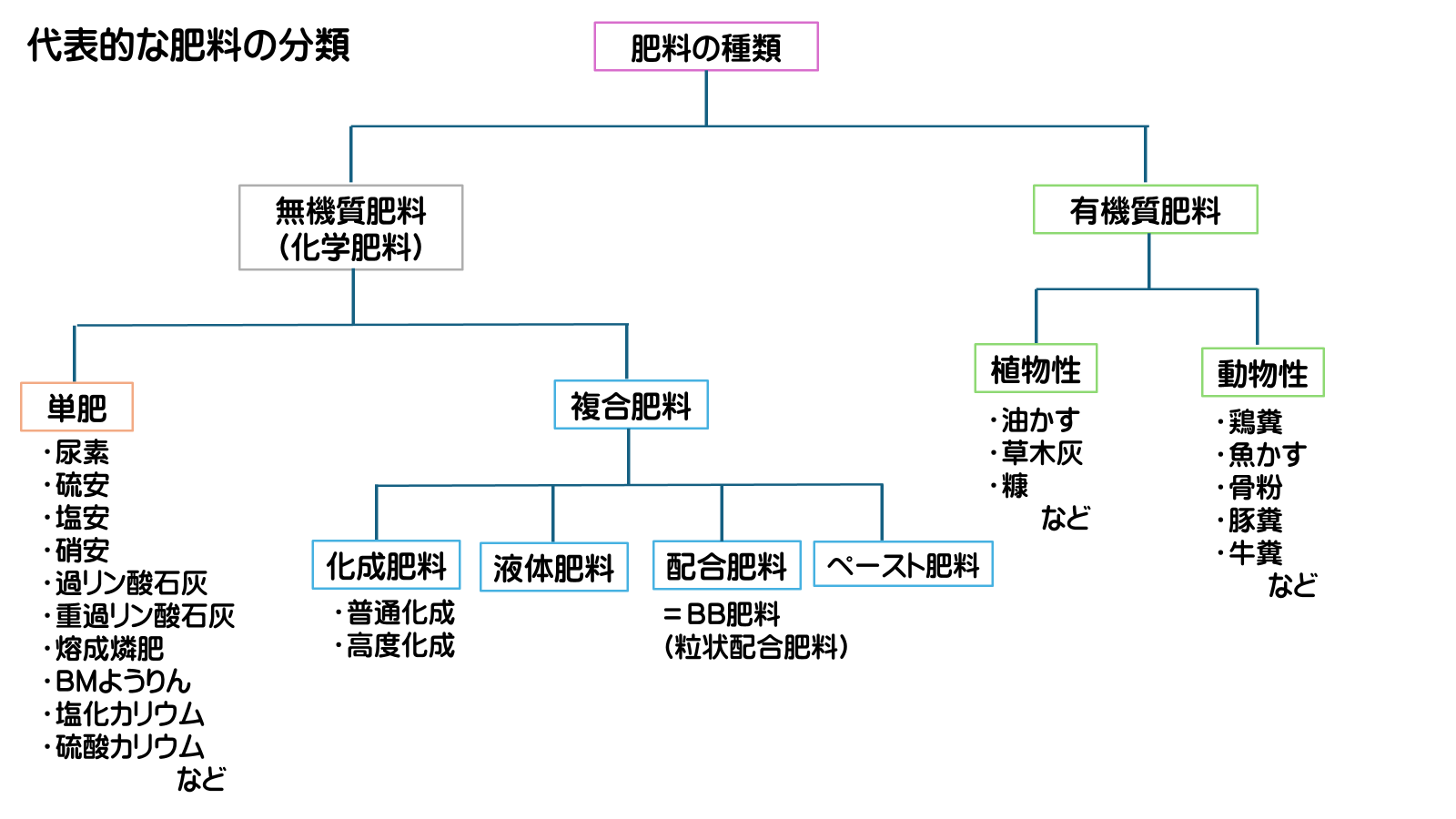 無機質の栄養素を1種類含む単一肥料(単肥)と2種類以上含む複合肥料があります。