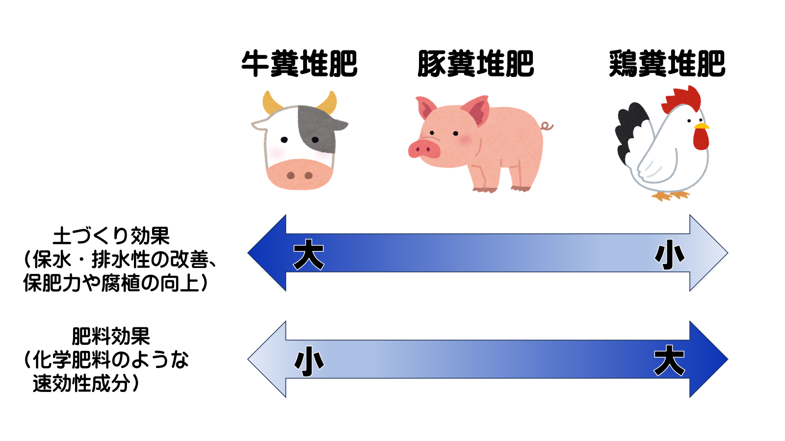 - 牛糞より高め⇒「牛<豚<鶏」の順で窒素が多いとされています。