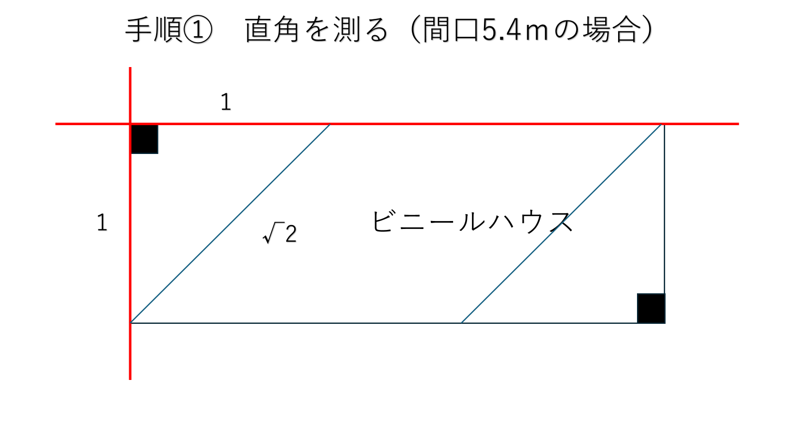 はい、設置場所の調査が終わりましたらビニールハウスを設置する位置決めをしましょう!ビニールハウスを組み立てるときに大切なのは直角を正確に出して最初のアーチパイプを組むことです!直角の出し方は皆が数学で学んだはずの三平方の定理を使います!詳しくは教科書見直してね。