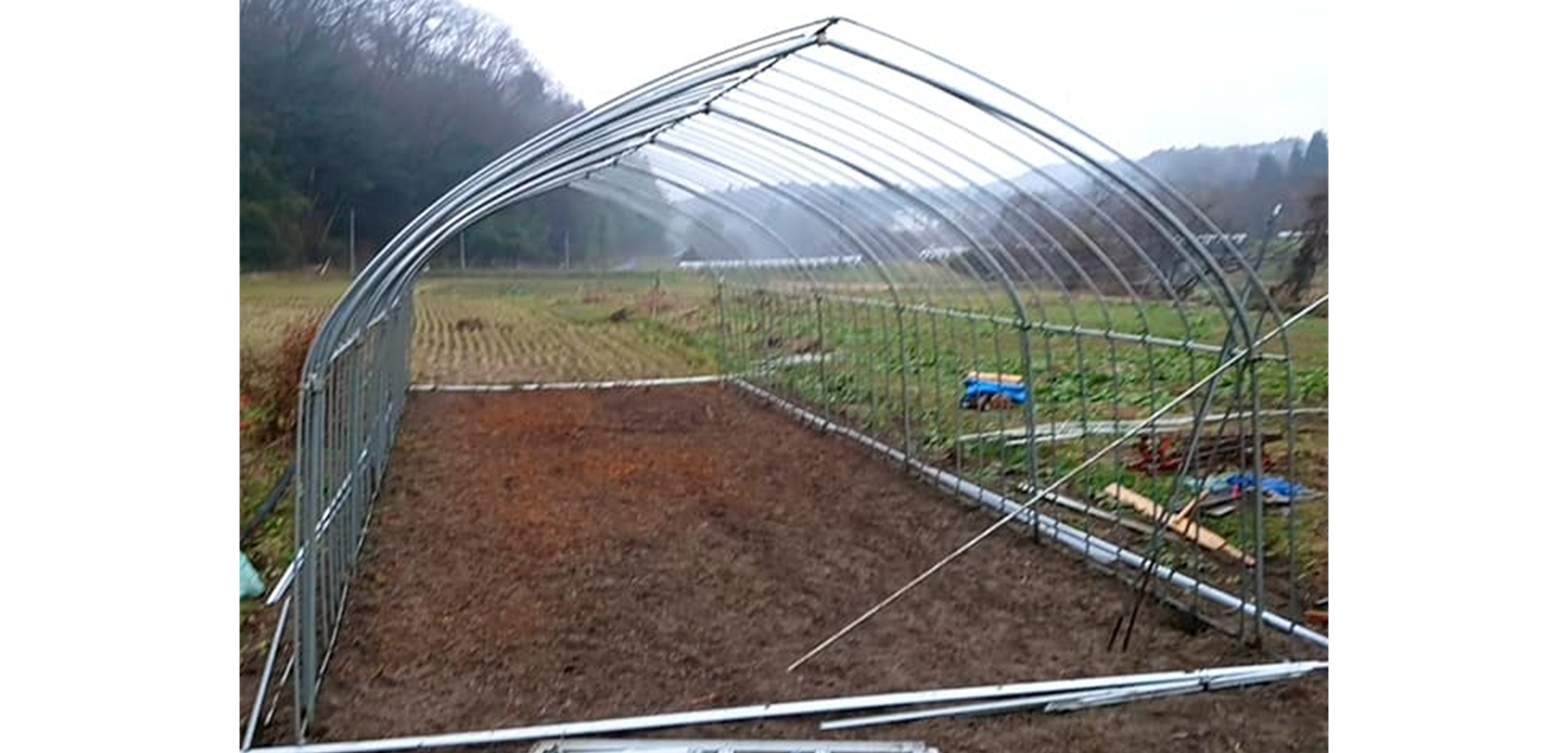 骨組み完成イメージです。このあとは、いよいよ妻面工事と側面のビニペット取付工事となります。詳しくは■トップページで解説していきますのでぜひ参考にしてみてください。