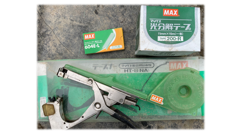 私達農家は植える本数が多く、効率化を計るために図る為にテープナー(誘引結束機)を使用しています。