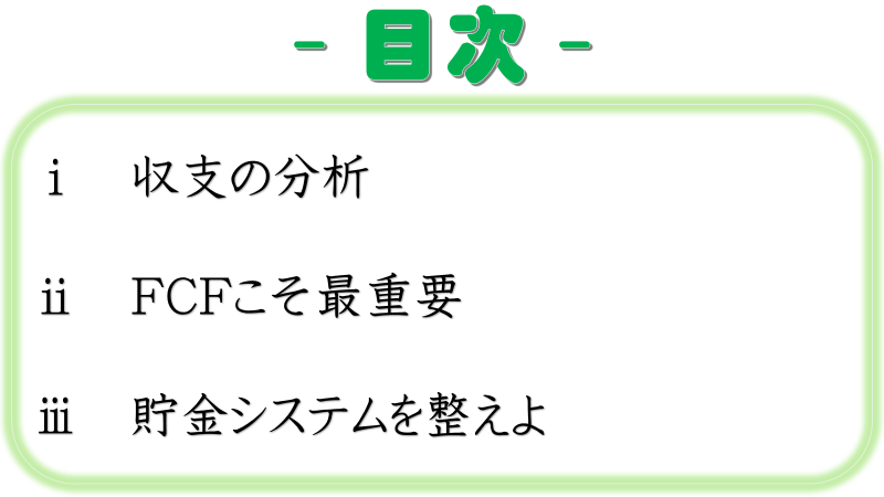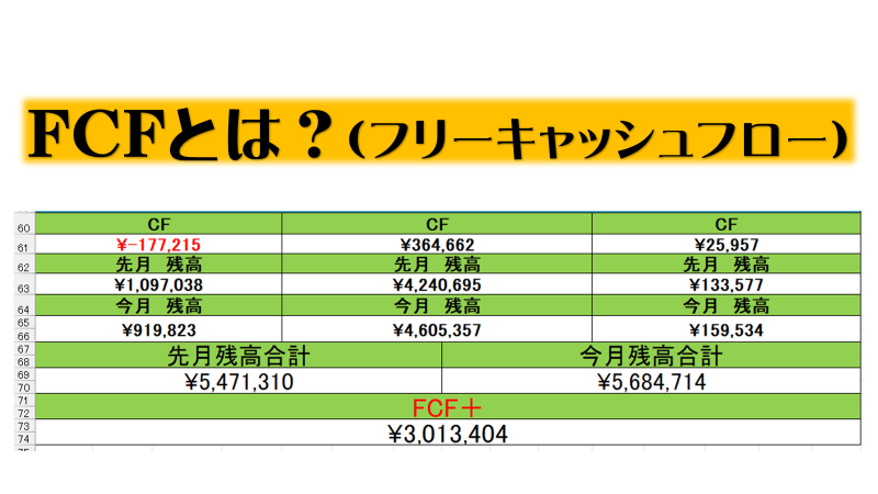フリーキャッシュフローというのは、毎月最後に残った本当の余力資金のことを指します。このFCFがかなり重要な数値となりますので絶対に覚えておいてほしいことです。簡単な例をあげると、