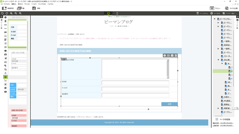 お問い合わせフォームの挿入は、ホームページビルダー内のパーツ一覧に「お問い合わせフォーム」という項目がありますので、そこから好きなデザインを挿入するだけです。他のデザインも挿入してみます。
