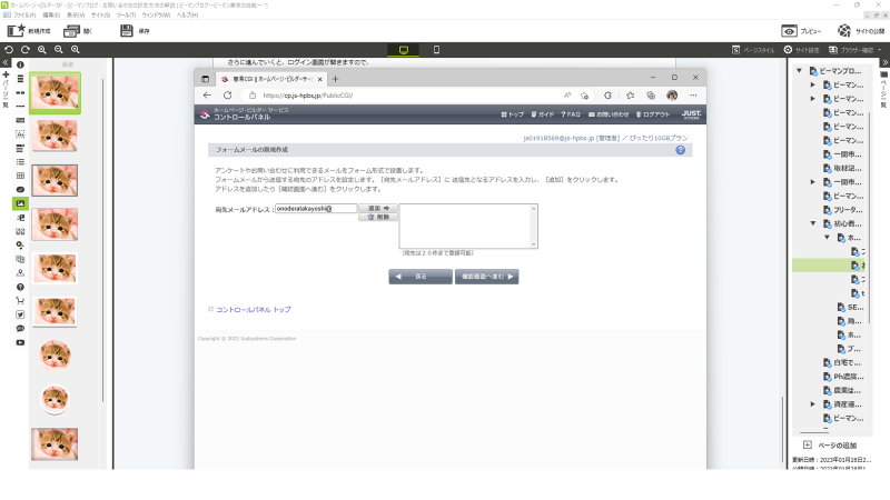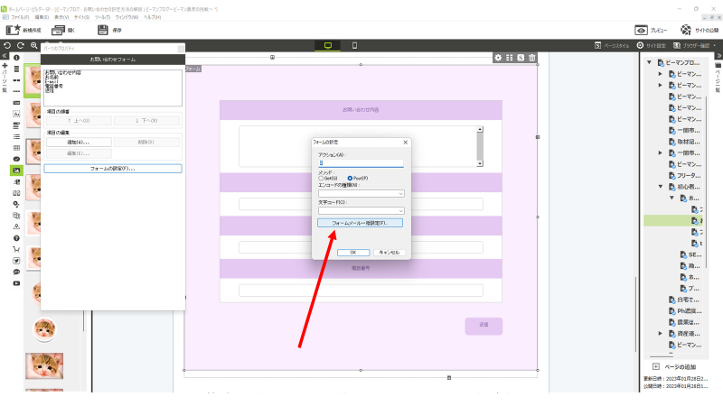 いろんなデザインがありますので迷いますね。お問い合わせフォームを挿入した次はお問い合わせフォームをクリックし上部にあるパーツのプロパティ、フォームの設定、フォームメール設定の順番でクリックしていきます。