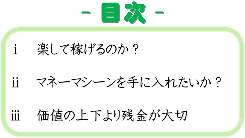 車を買うか?マネーマシーンを買うか?私は単純にこう考えて恐怖心を乗り越えてきました。車を勝った人は維持や車検、修理費がかかります、価値は下がりますし故障して価値がゼロになることもあります。