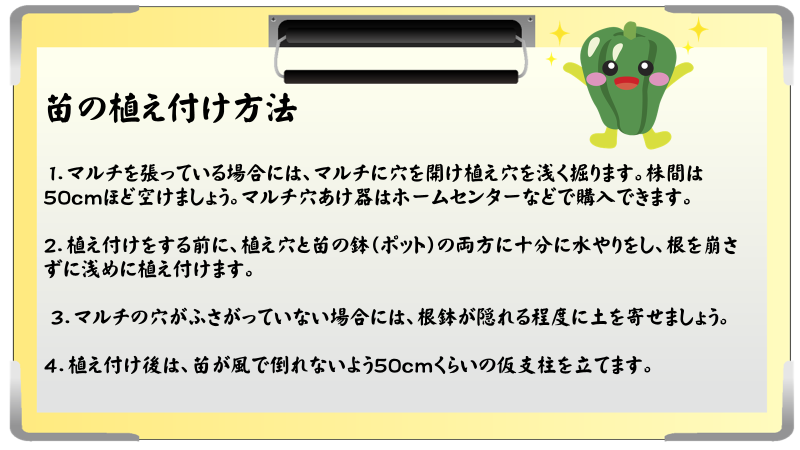 ・ピーマンは野菜の中で生育適温がとりわけ高い植物ですが、スムーズな活着のためには定植時の地温確保が最も重要です。定植2週間前までにはマルチ設置まで完了させます。