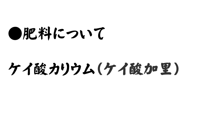ケイ酸カリウム(珪酸カリウム)は、緩行性カリ質肥料で、カリウム(加里)と苦土(マグネシウム)のほかホウ素や石灰、鉄などの成分がケイ酸と結合された肥料です。