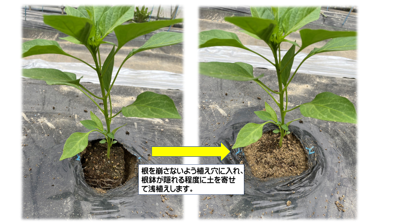- ・深植え:根鉢が乾燥しないのでしおれにくく良い状態に見えますが、土の冷たい位置に定植するため根が動きにくく活着が遅れてしまいます。