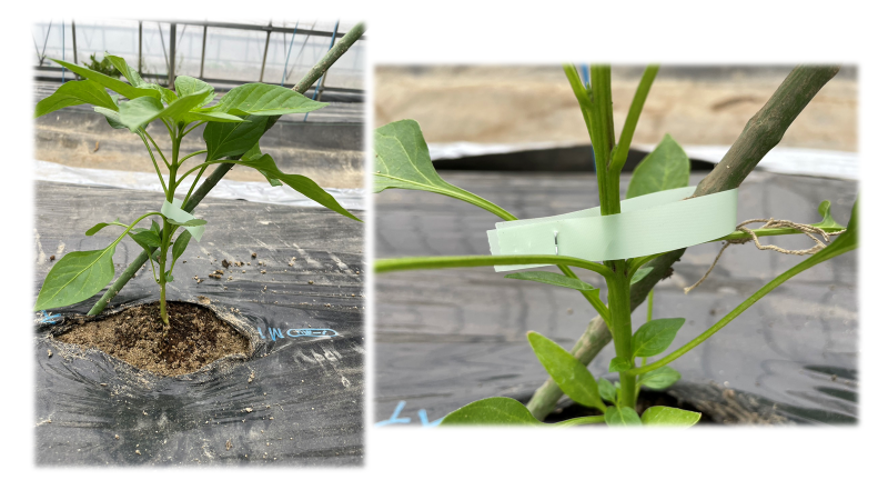 苗と支柱をテープナー(又は麻紐など)で結ぶ際、株が成長して茎が太くなっていきますので、指1本分程度余裕を持って固定しましょう。