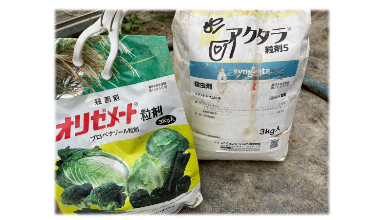 ※植え穴にオリゼメート粒剤やアクタラ粒剤のような殺虫殺菌剤を入れて土と混ぜてから植えると栽培初期の病害虫予防になります。ピーマン栽培の場合オリゼメートは斑点病、うどんこ病に効果があり、アクタラはアブラムシ類やアザミウマ類に効果があります。