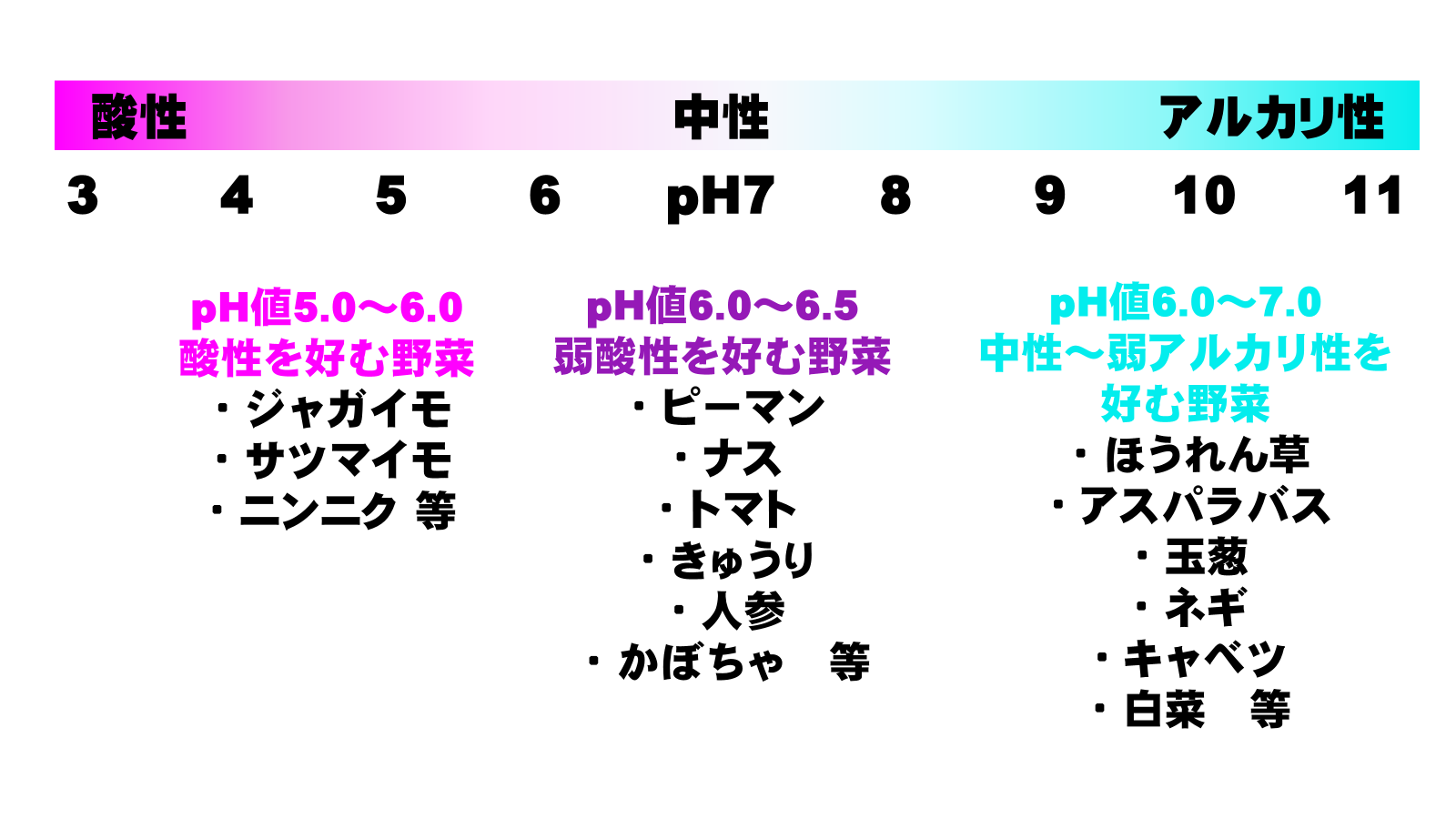 | 6.0~6.5 | ピーマン、ナス、トマト、きゅうり、人参、カブ、かぼちゃ、ニンニク、ブロッコリー、大根、里芋、小松菜、ゴボウ等 |