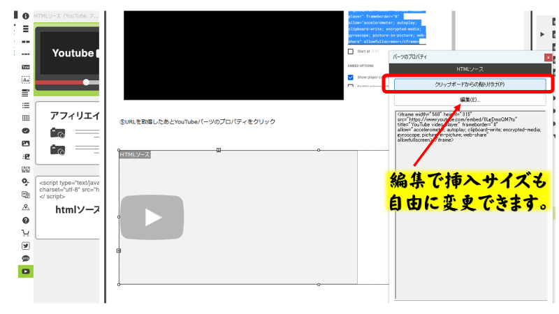 ⑤URLを取得したあとYouTubeパーツのプロパティをクリック