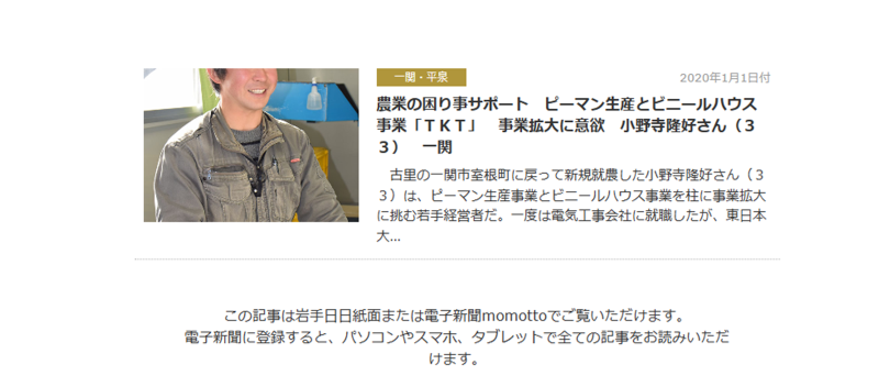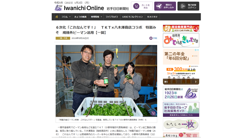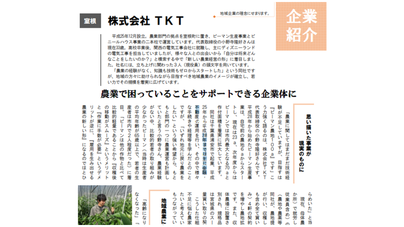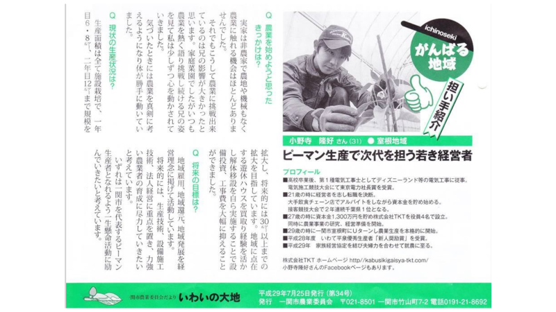 ■I-Style 広報いちのせき ■平成29年 こしぇるびと JAいわて平泉 ■平成20年 東京電業協会 入賞 ■平成29年 担い手紹介 一関市農業委員会 ■令和5年5月一関市議会だより ■平成30年 クラウドファンディング挑戦 ■平成30年 ピーマン味噌発売 TKT×八木澤商店 コラボ ■平成30年 いちのせき農村暮らしファイル 一関市市民センター ■令和1年 idea 11月号 一関市民活動センター ■令和2年 令和新時代の挑戦~㈱TKT一関市~岩手日日新聞