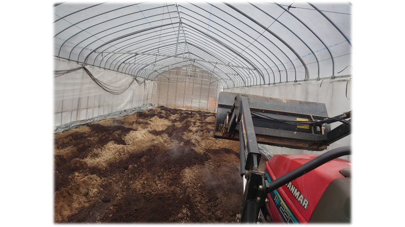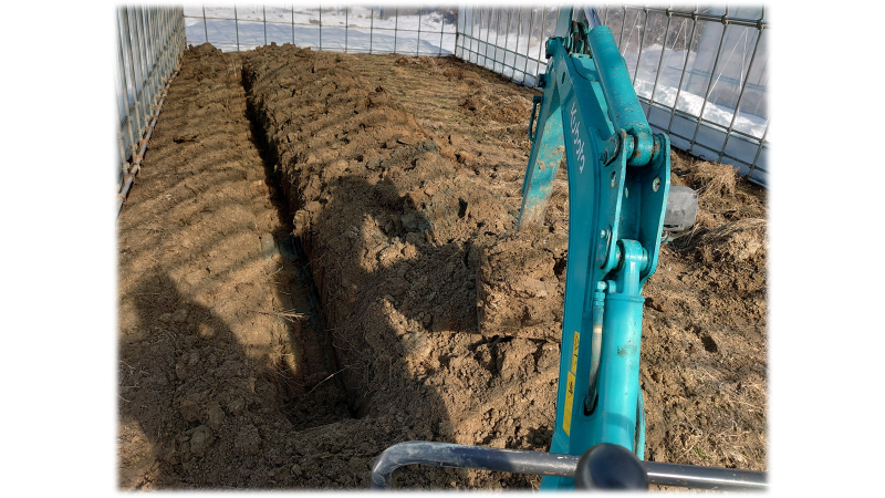 籾殻と竹を投入し終わったら、バックホウやスコップを使い埋め戻します。そして最後に牛糞堆肥などを散布しましょう。