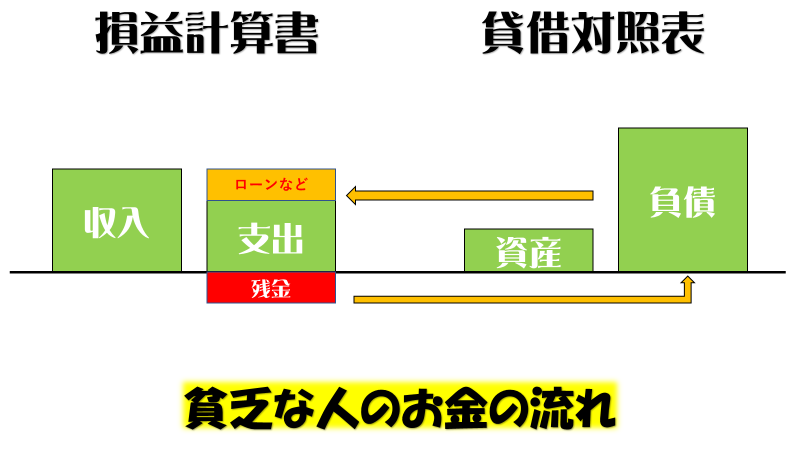 逆に貧乏な人は資産を買うことを知らない。状況は上の図の通りです。常に残金は少なく、その少ない残金でまた負債を増やすのである。