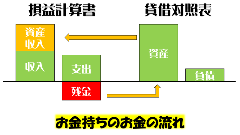 有価証券やビジネスといわれる本当の資産からは資産収入が入ってきます。その資産収入と報酬などの収入を組み合わせることで残金が余りその残金でまた資産を買い増しできている状態です。事業の負債はゼロです。