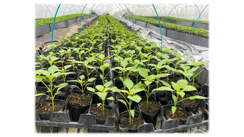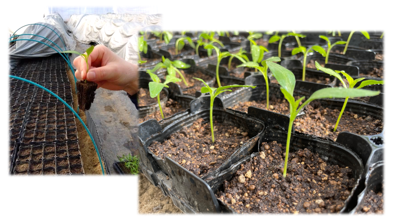 育苗中のピーマンの苗が大きくなってきたら、隣り合う葉同士が触れ合わないように“ずらし”の作業を行います。