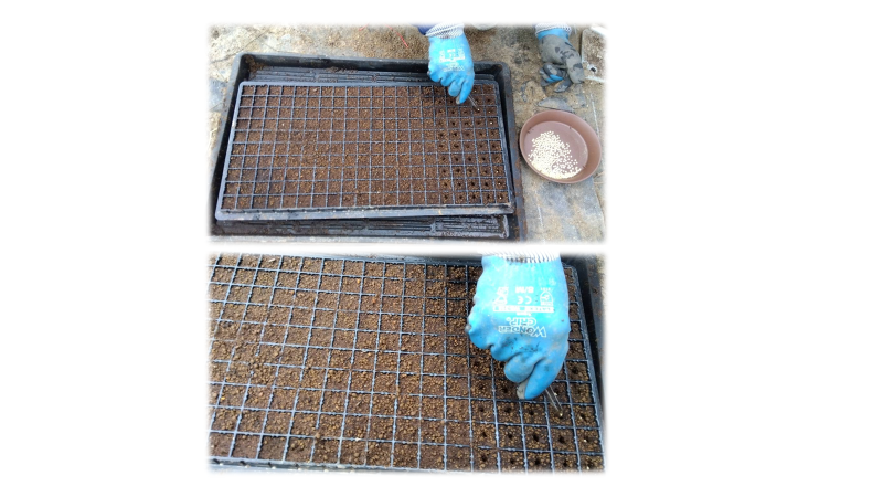 地温が30℃前後に保たれていることを確認し、育苗ポットやセルトレイに種まき用の培養土を入れ種をまきます。