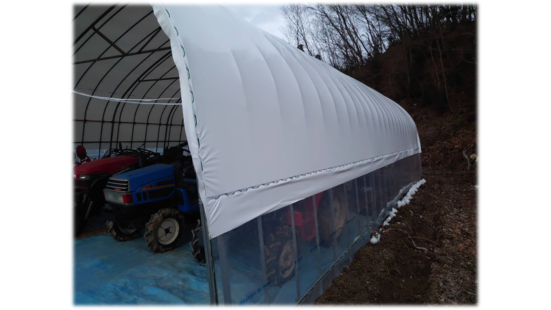 自社で実験している倉庫、車庫ハウスですが、積雪や暴風にも耐え高い耐久性を証明しています。