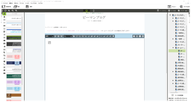 上の図はホームページビルダーを開いた時の画面となります。左側のメニューバーには様々なコンテンツパーツが用意されており、それらを空白のページに挿入したり、文章を書いたりすることで自分だけのページを作成することができます!
