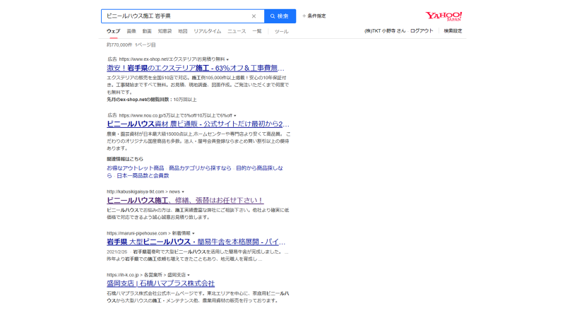 など、いろんな検索キーワードを打ち込んでも株式会社TKTが管理しているビニールハウス受付窓口が表示されると思います。上位表示されると高い確率でホームページを見て頂けるようになります。