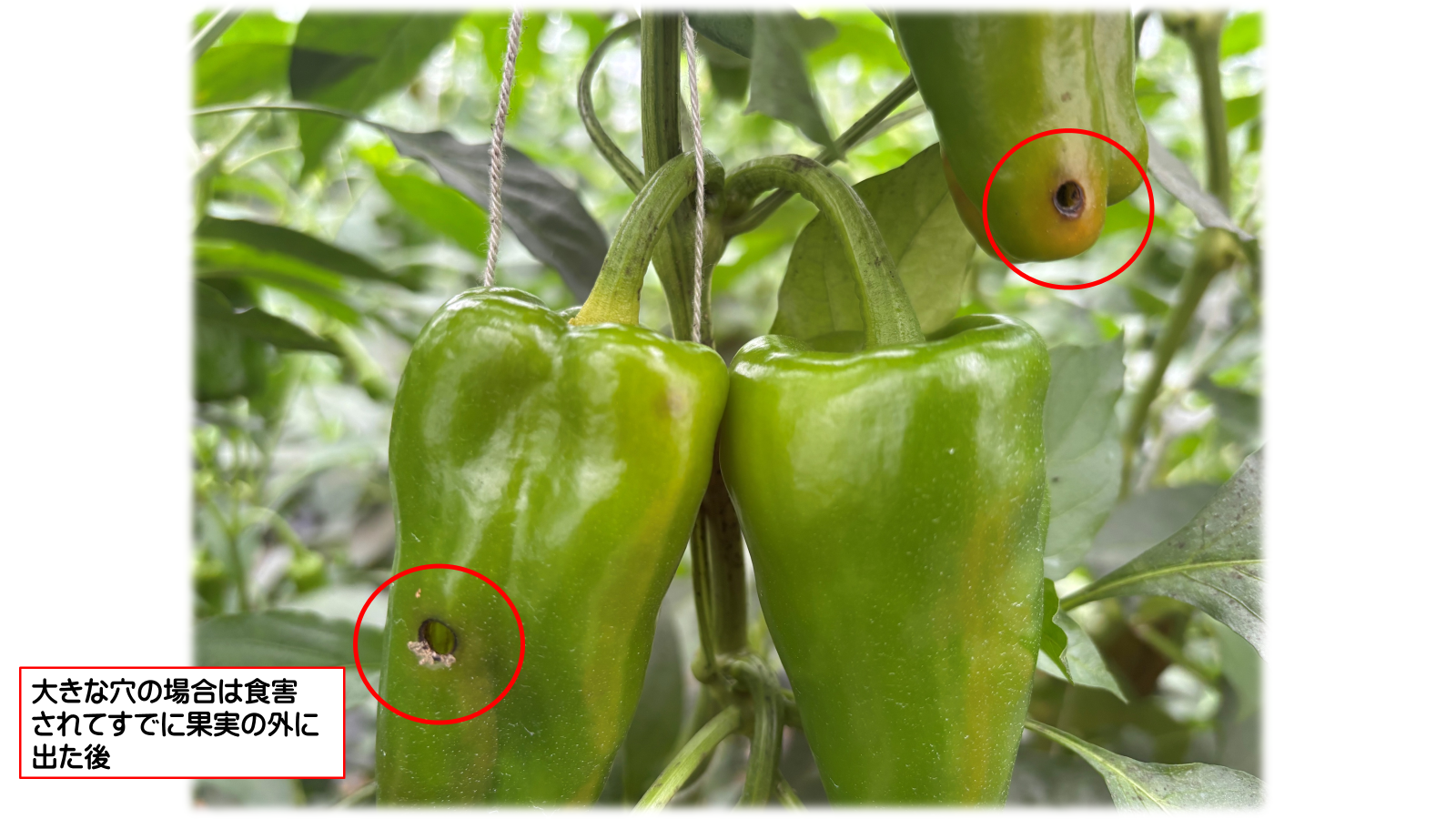 新しい食痕や被害果を見つけたら、その周辺に幼虫がいるので注意深く調べて潰して駆除します。 防虫ネットを展張し、ハウス内への侵入を防ぎます。