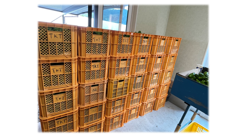 朝からピーマン収穫をしました。室根農地と藤沢農地合わせて36コンテナ収穫できました!