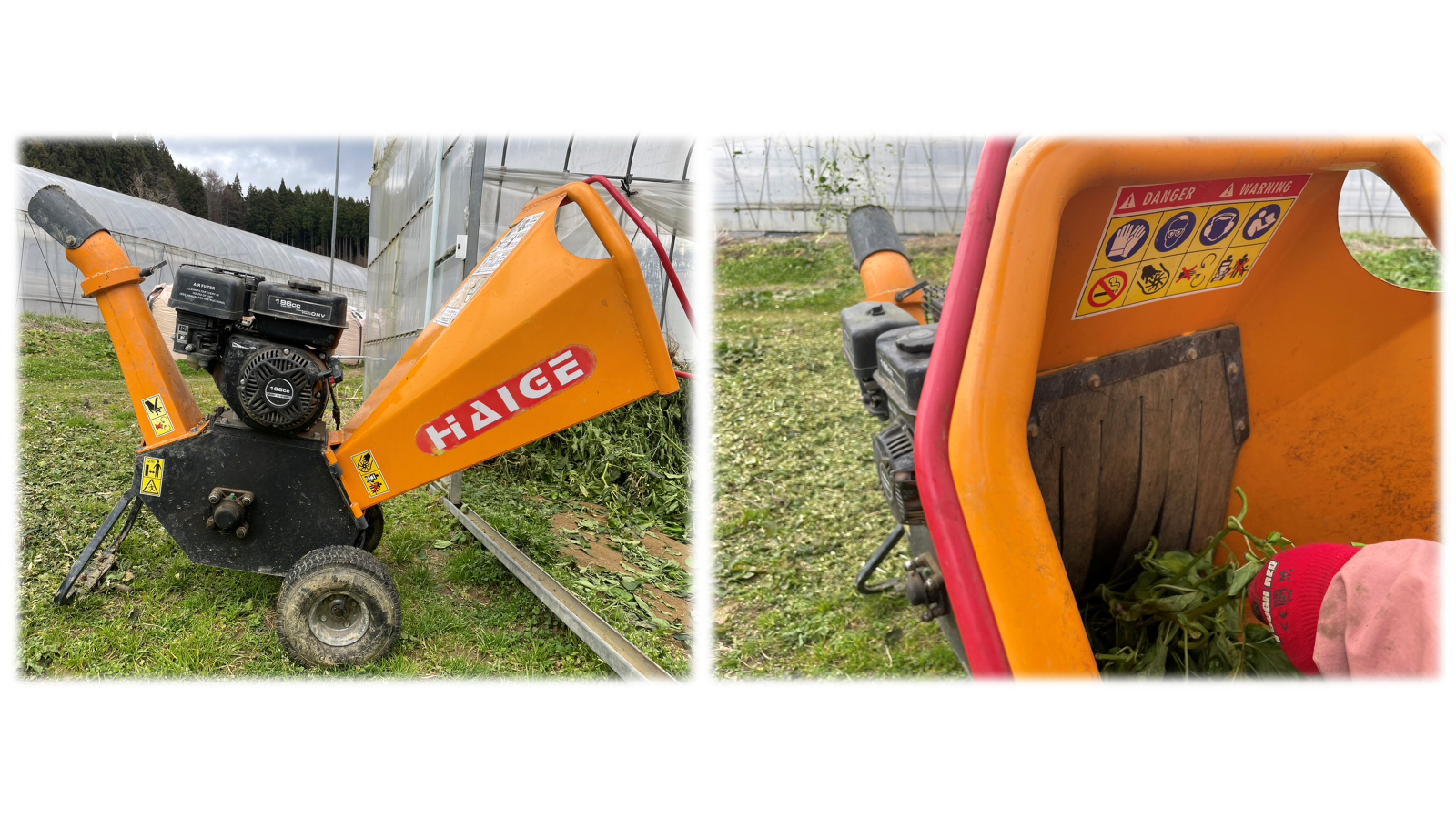 抜いたピーマンの樹はウッドチッパーにかけて粉砕し、圃場外に廃棄します。