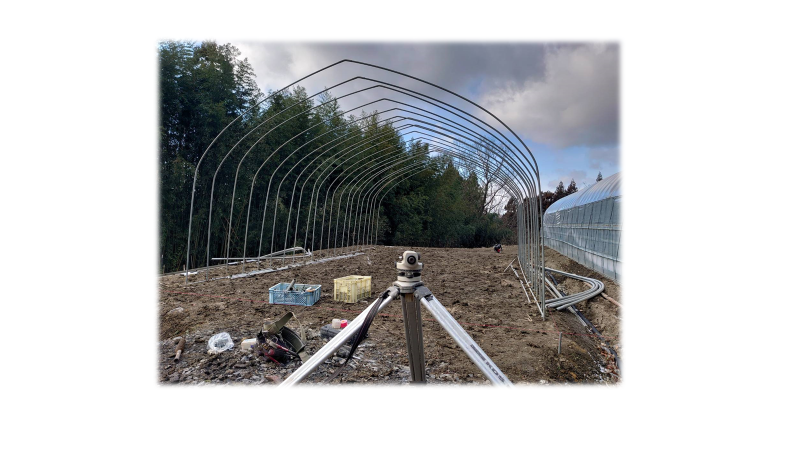 アーチパイプを立て、オートレベルと呼ばれるレーザー測定器で平行を見ます。