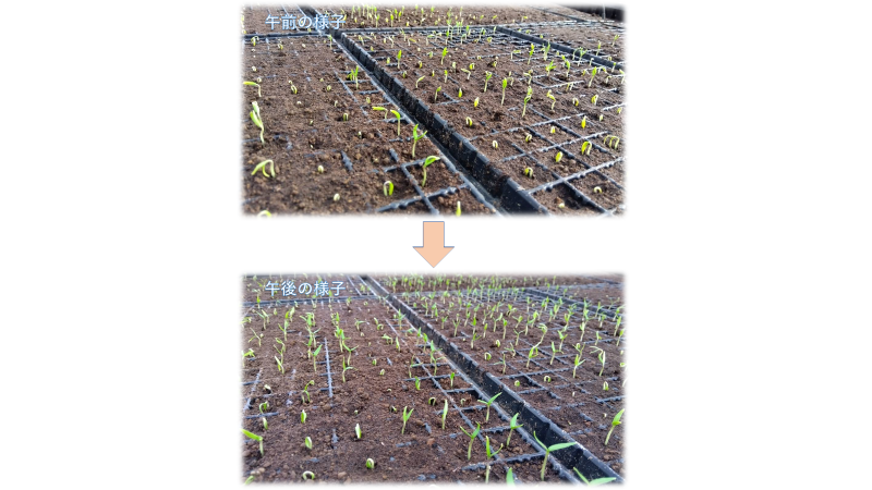 一日の中でも、午前と午後で一目瞭然で分かる芽の成長のスピードに毎度驚かされます!