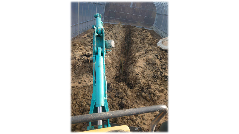 ハウス内の排水対策として、重機で掘削作業をしております。