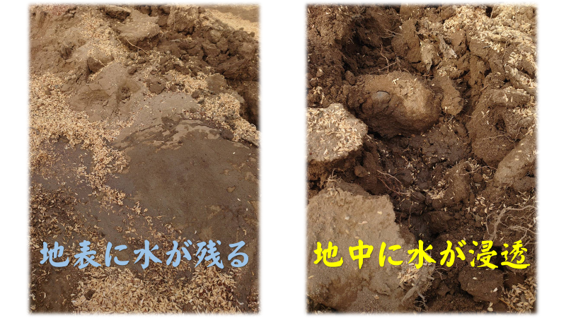 今回の畑はもともと水はけは良いところですが、それでもプラソイラをかけていない左側は地表に水が溜まり続けていました。