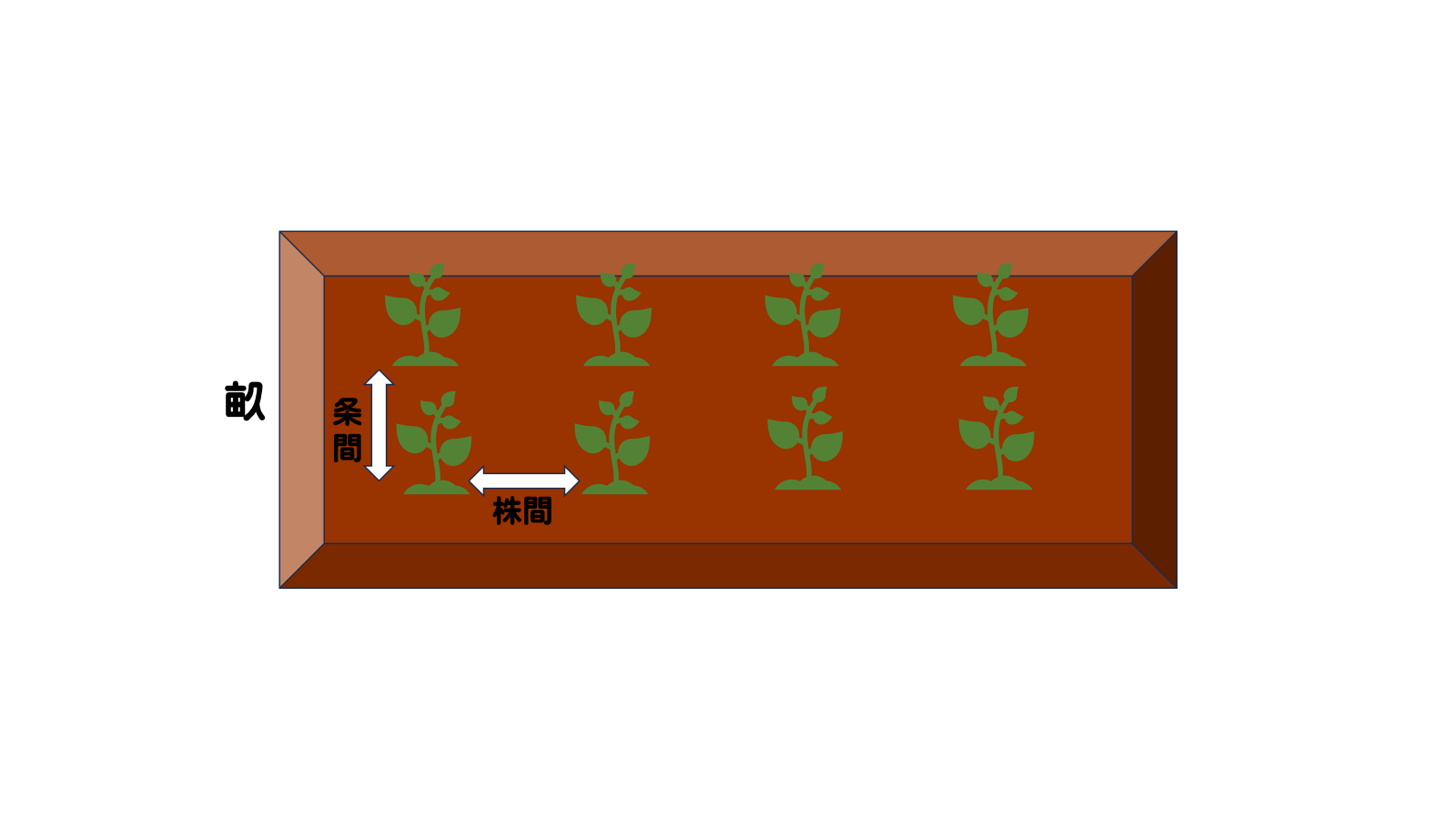 この列のことを条(じょう)と呼び、条の苗の中心から隣の条の苗の中心までの距離のことを条間と言います。