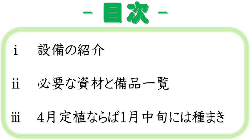 今回は育苗設備の資材や設備をご紹介します。ではよろしくお願いします。