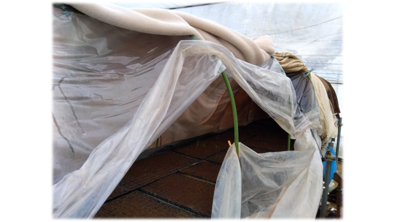 育苗のハウスの中でさらに2重カーテン、そしてトンネル保温で1月~3月までの低温から苗を守り抜く必要があります。