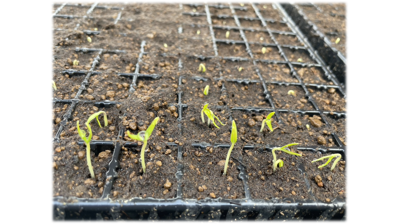 種まきをして1週間程度で芽がでてきます。発芽するためには温度が25℃程度ないといけないので、育苗設備はハウス内で、さらに育苗設備の中で保温する方法が安心です。