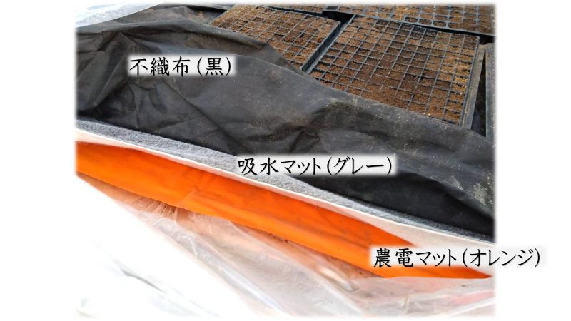 育苗マット、吸水マット、不織布を敷きその上にセルトレイを置きます。保温性能もかなり高まりますので安定した発芽が期待できます。