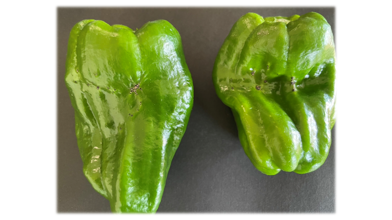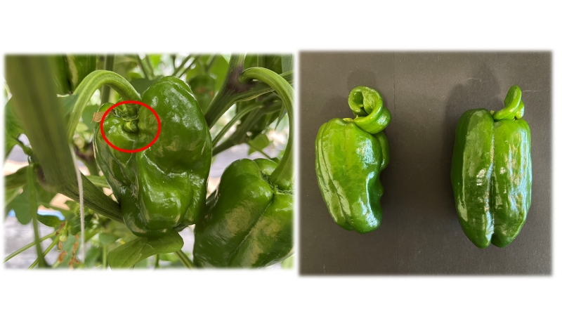 実の先が細長くなってしまったり、ひん曲がってしまったり、しわが寄って形が悪くなってしまったり、スーパーで売っているような真っ直ぐふっくらとした実にならないピーマンのことです。このように形が悪いピーマンのことを「変形果」や「奇形果」、「異型果」と言います。