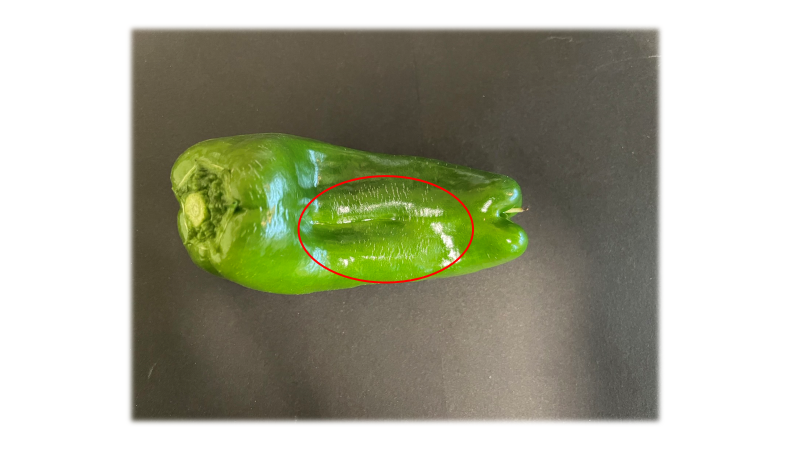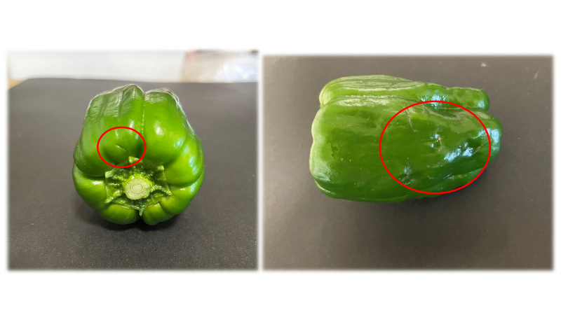 果実を落としてしまったり何かにぶつけてしまったり、ハサミや爪等で果実が傷ついたり、何らかの理由で可食部が変色してしまったピーマンのことです。