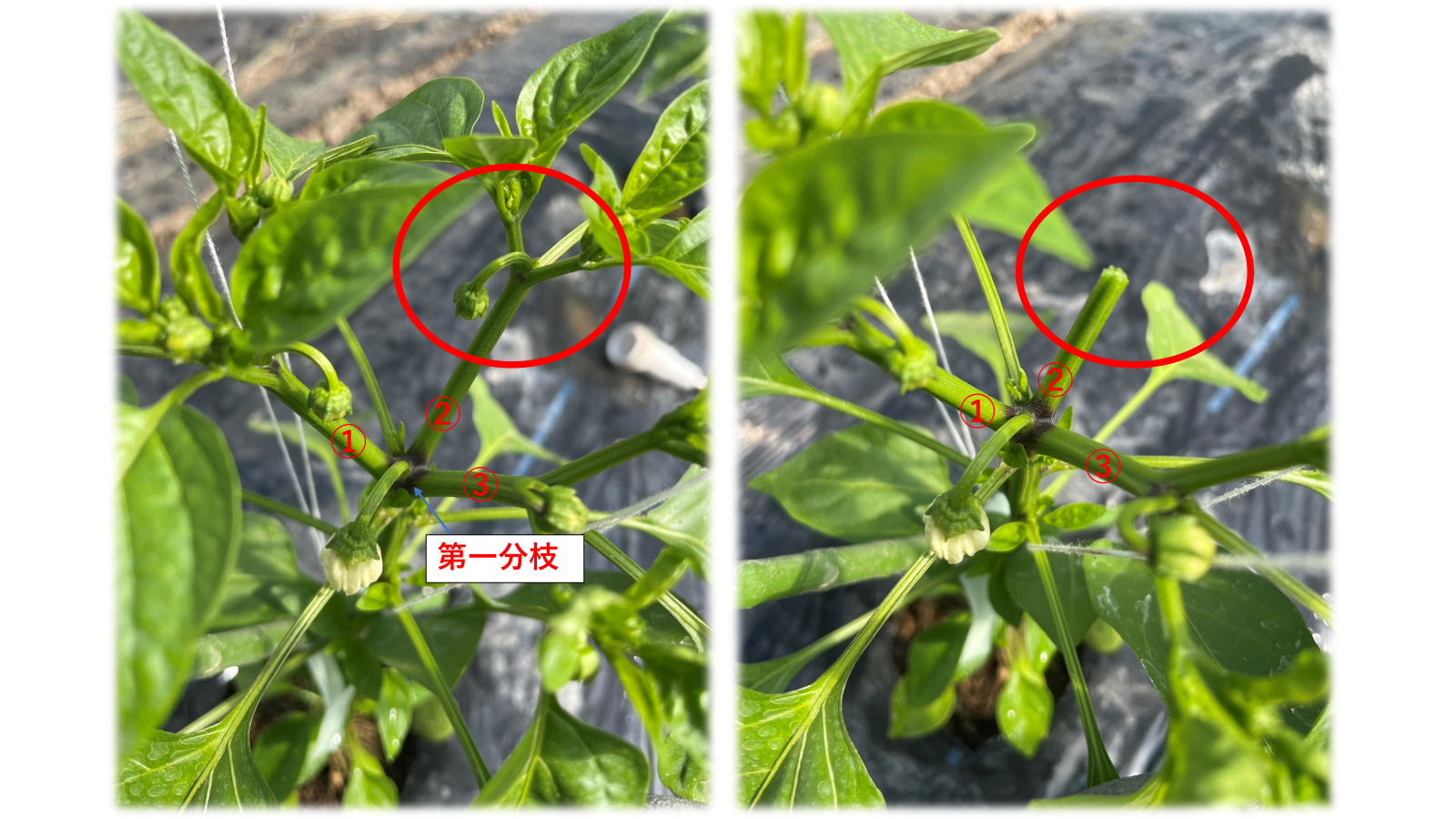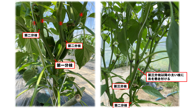 第三分枝以降は太い枝と細い枝の発生が見られます。第三分枝以降の太い方の枝4本に誘引の為に張った糸にピーマンの枝を絡ませ、細い枝を側枝として管理していきます。