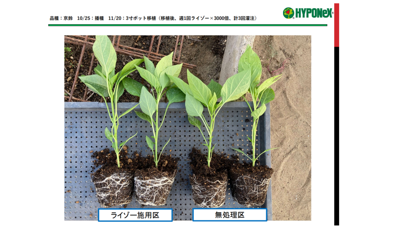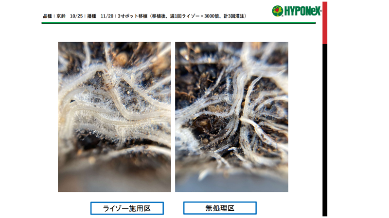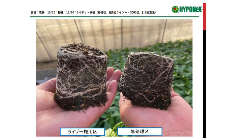 ・高い発根伸長力で根量が増加するので株元をしっかりつくり、ぐらつきがなくなり安定します。