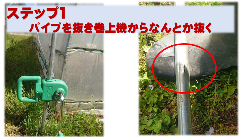 まずは巻上用の垂直に指してあるパイプを巻上機から抜きます。このとき、パイプが破裂している為、簡単には抜けません。パイプの前後をハンマーで軽く叩きながら巻上機が壊れないようにパイプを抜きましょう。