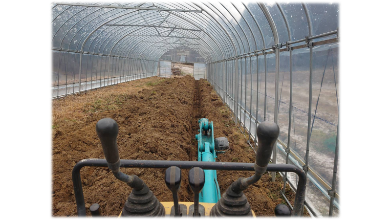 自社保有のバックホウを使用しハウス内の硬盤を粉砕します。